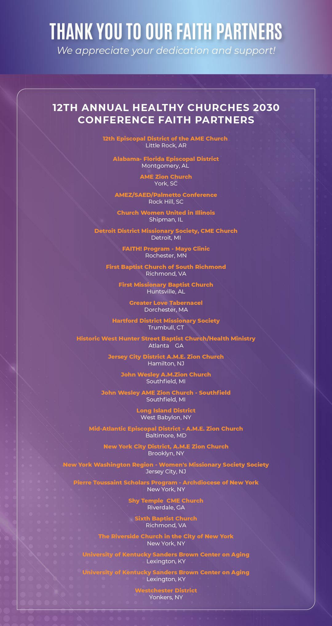Host the streaming of the 11th Annual Healthy Churches 2030 Conference at your church or community center for a one-time donation of $1000.